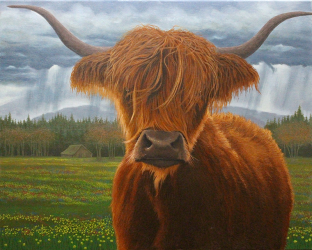 A majestic Highland cow stands in a grassy field surrounded by wildflowers. Dark clouds loom overhead, adding a dramatic touch to the landscape.