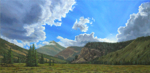 A scenic landscape featuring a vast meadow with surrounding mountains, under a sky filled with dramatic clouds. Sunlight filters through, highlighting the lush greenery.