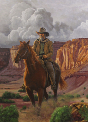 A cowboy on horseback traverses a vast desert landscape surrounded by rugged cliffs. The scene is set against a backdrop of dramatic clouds.