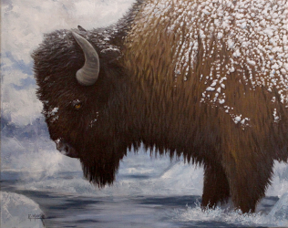 A buffalo stands in a snowy landscape, showcasing its thick fur covered in snow and frost. The scene captures a serene and cold winter day in the wilderness.