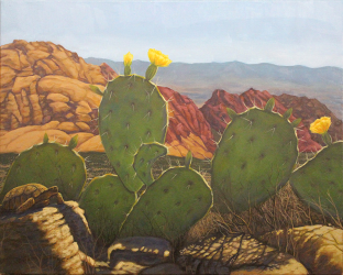 Cactus with yellow flowers is set against a rugged desert landscape, featuring distant mountains and rocky terrain. A tortoise relaxes on a sunlit rock in the foreground.