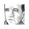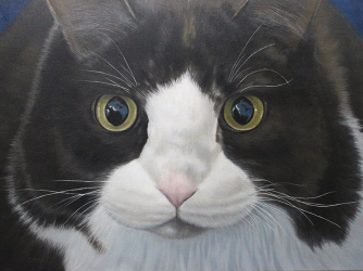 A close-up portrait captures the intense and curious gaze of a tuxedo cat. The detailed rendering highlights its distinctive black and white fur.