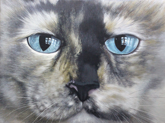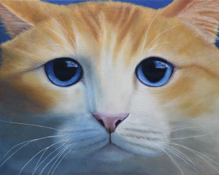 The image showcases a detailed close-up of a cat's face, highlighting its striking blue eyes. The fur appears soft with a gentle color gradient.