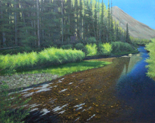 A tranquil mountain stream meanders through a lush forest, surrounded by towering evergreen trees. The scene is calm and picturesque, with clear reflections on the water's surface.