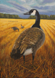 A large Canada goose stands prominently in a golden field, while others graze in the background. The scene captures the peacefulness of nature.