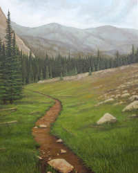 A serene landscape of a winding path through a green valley, with tall trees and distant mountains under a cloudy sky. The scene evokes a sense of calm and adventure.