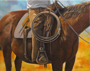A cowboy on horseback traverses a vast desert landscape surrounded by rugged cliffs. The scene is set against a backdrop of dramatic clouds.