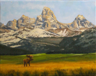 A lone moose stands in a field, set against the backdrop of towering, snow-capped mountains. The scene captures the serene beauty of a mountainous landscape.